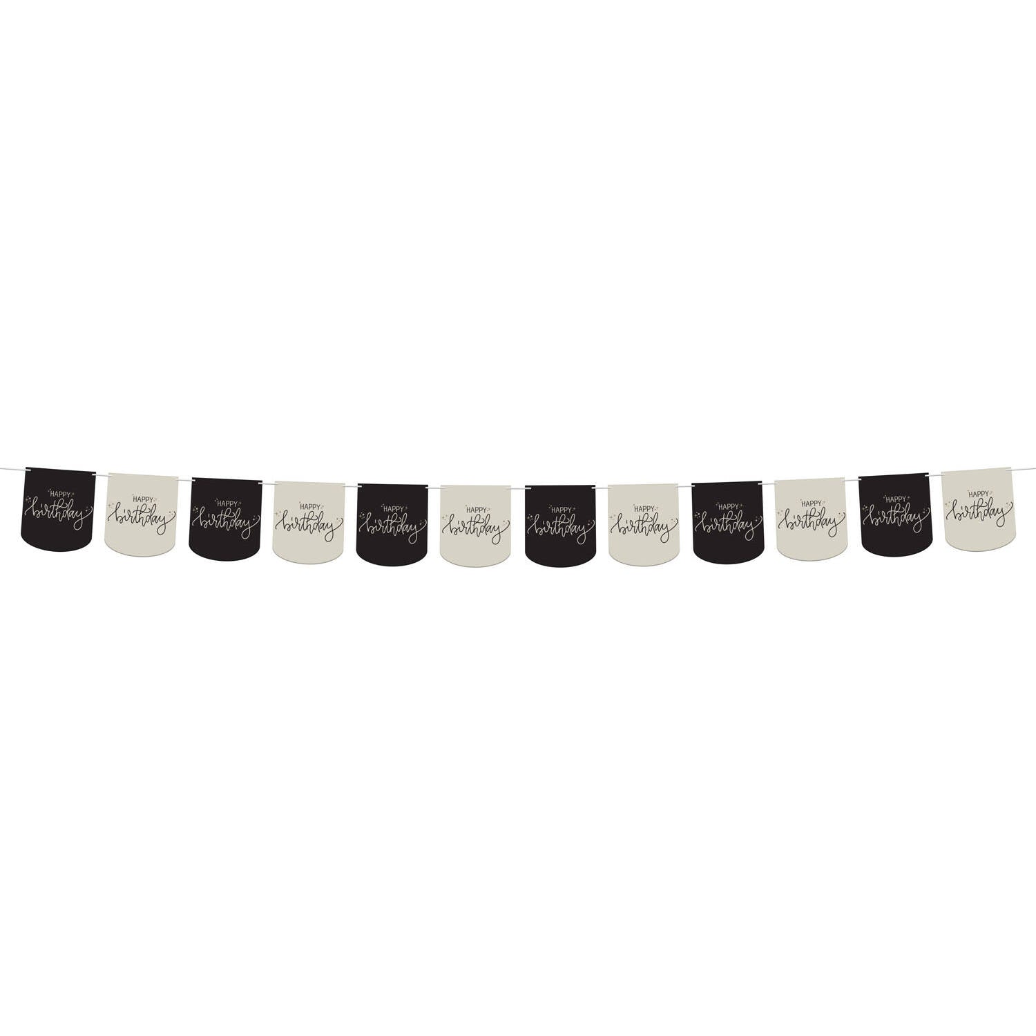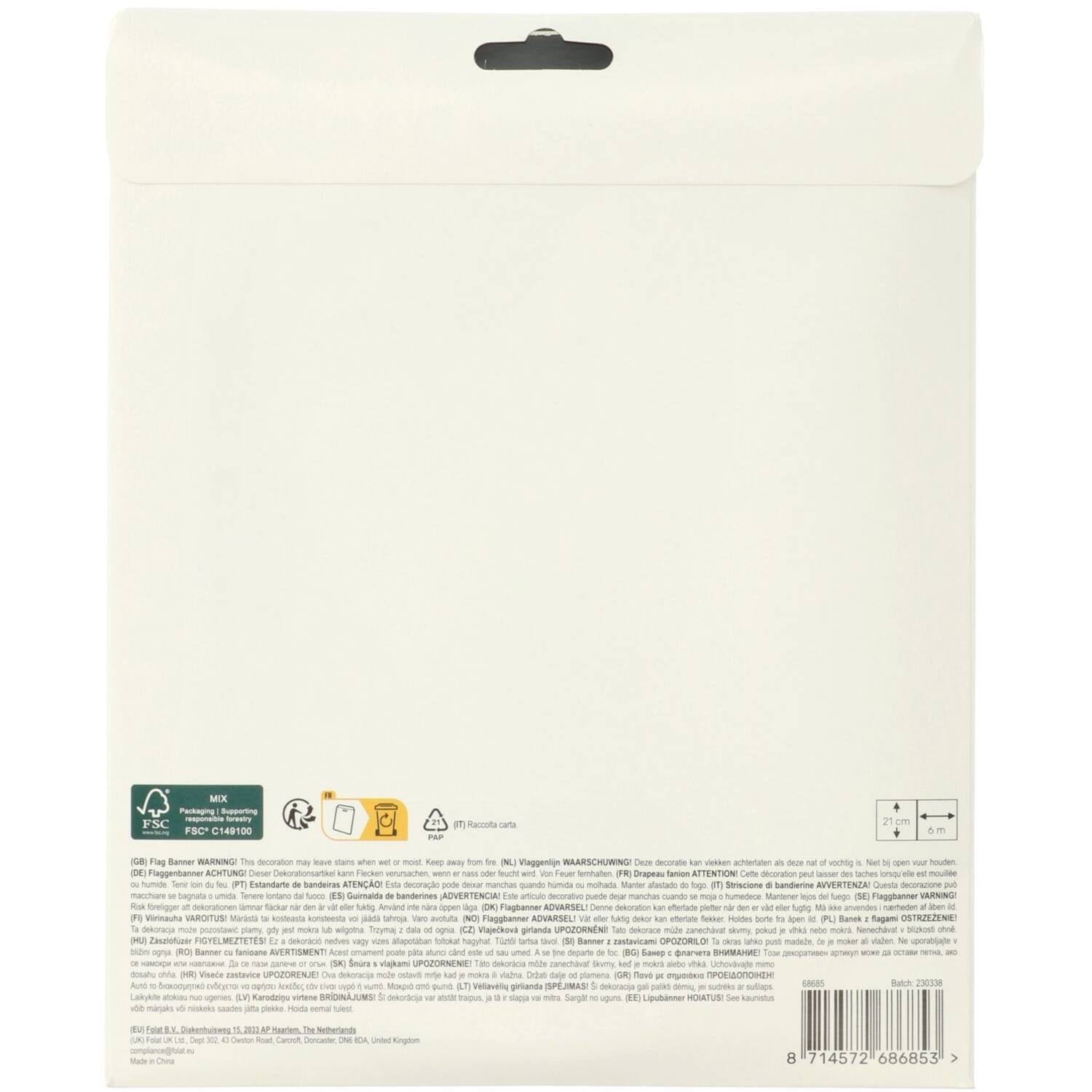 Po prostu ładna linia flagi. Flagline - Cream Noir - 6 metrów. Zawartość: 1 linia flag. Na przykład do wykorzystania podczas następujących przyjęć/okazji: Urodziny. Piękna linia flag z czarnymi i kremowymi flagami Na tej 6-metrowej linii flag znajduje się 16 flag o wymiarach około 18 x 21 cm. Wszystkie flagi mają napis "SZCZĘŚLIWYCH URODZIN". Flagi są drukowane dwustronnie. Można je przesuwać tam i z powrotem po białej wstążce. Ta linia flag należy do kolekcji Crème Noir od Folat. Ten przedmiot jest wykonany z papieru FSC.