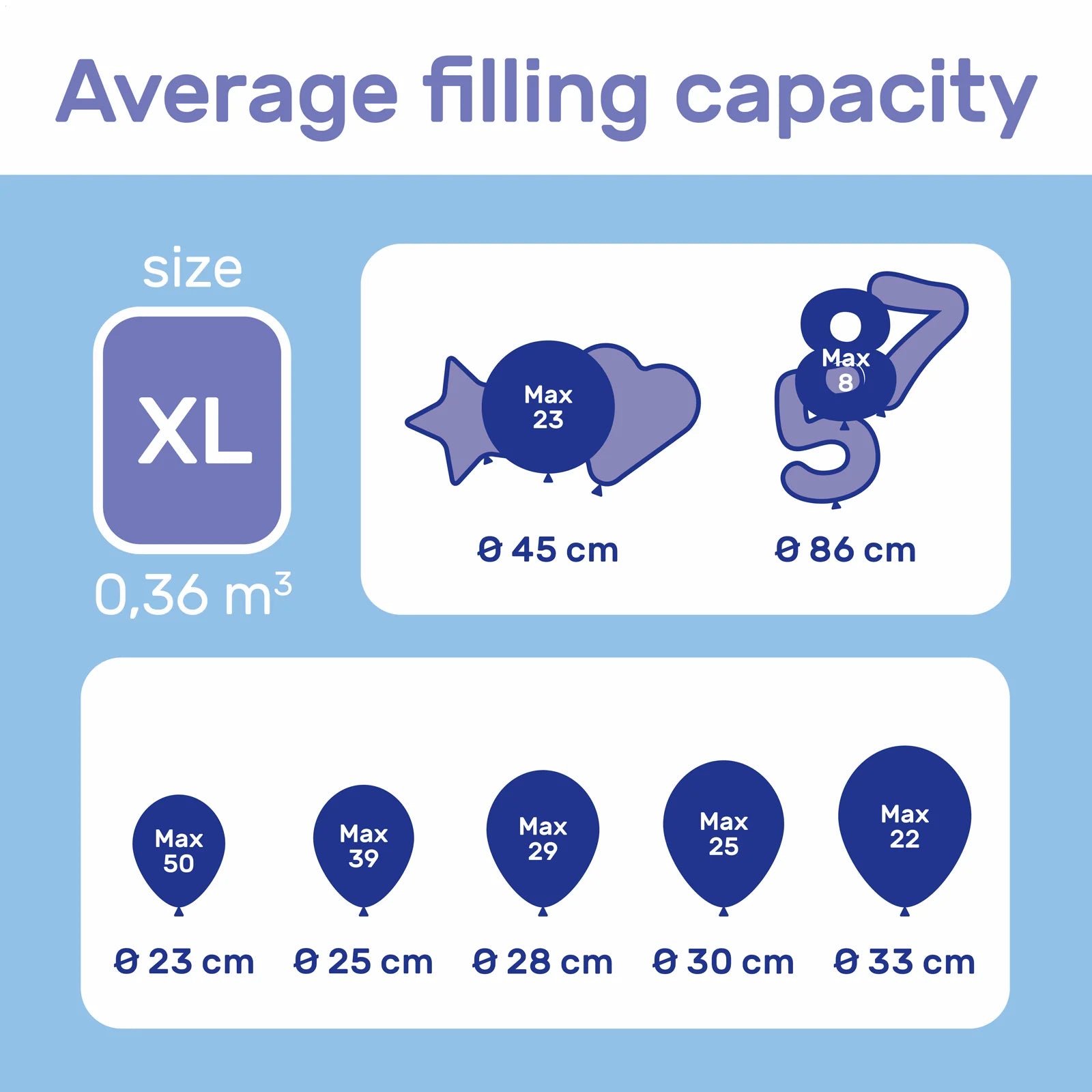 Każdy centymetr większy balon wpływa na jego pojemność. Zbiorniki z helem są oparte na balonach 25 cm, jeśli używasz na przykład balonów 30 cm, możesz uzyskać tylko o połowę mniej ze zbiornika z helem.