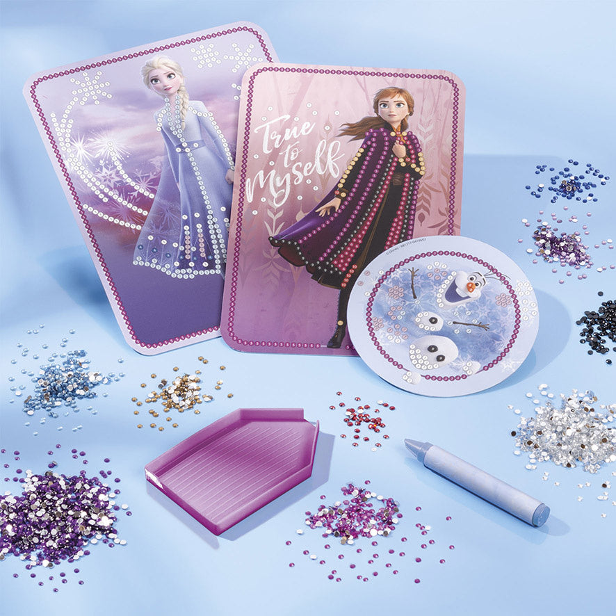 - Udekoruj 3 luksusowe karty Frozen za pomocą ponad 1300 brokatowych kamieni, w tym narzędzia do aplikacji i tacki na szczaw