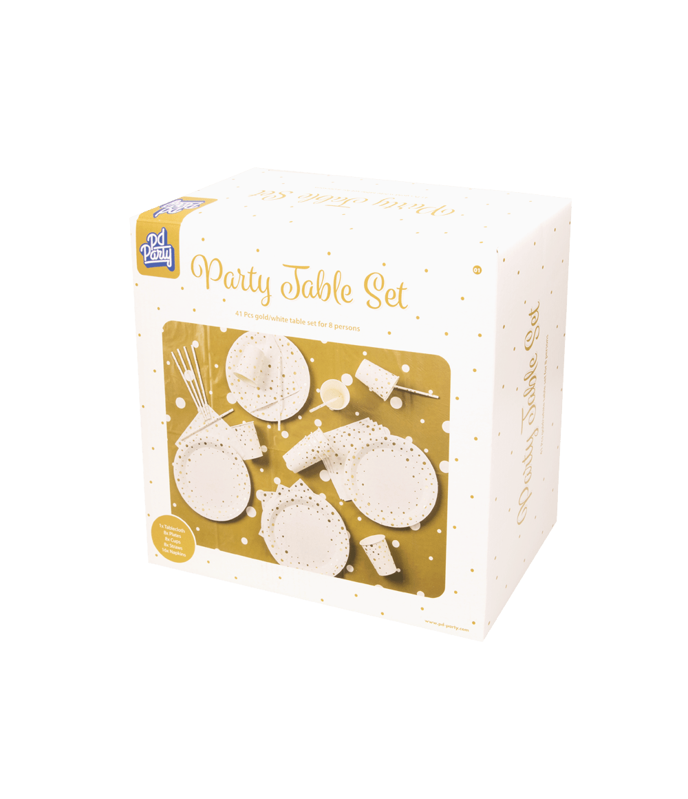 Dzięki temu zestawowi stół można udekorować w wyjątkowo świąteczny sposób, a zastosowane złoto-białe kolory dodają szyku. Ten biało-złoty zestaw stołowy składa się z obrusu, 8 kubków, 16 serwetek, 8 talerzy i 8 słomek i jest sprzedawany na 4 sztuki. Oprócz koloru biało-złotego, zestawy stołowe są również dostępne w kolorach różowo-czarnym i czarno-złotym. Zestawy stołowe są dostarczane w ładnym pudełku, dzięki czemu możesz je od razu ładnie zaprezentować w sklepie