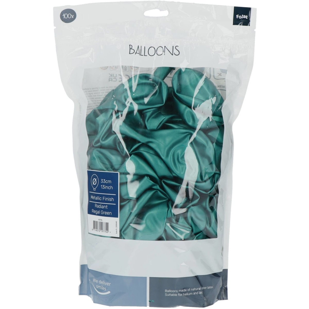 Balony Radiant Regal Green Metallic 33cm - 100 szt. Zawartość: 100 balonów lateksowych. Kolor: Zielony. Efekt kolorystyczny: metaliczny. Do wykorzystania na przykład podczas następujących przyjęć/imprez okolicznościowych: Urodziny, Impreza dla dzieci i Impreza tematyczna. Każdy balon mierzy 13 cali/33 cm. Produkt jest wykonany z lateksu.
