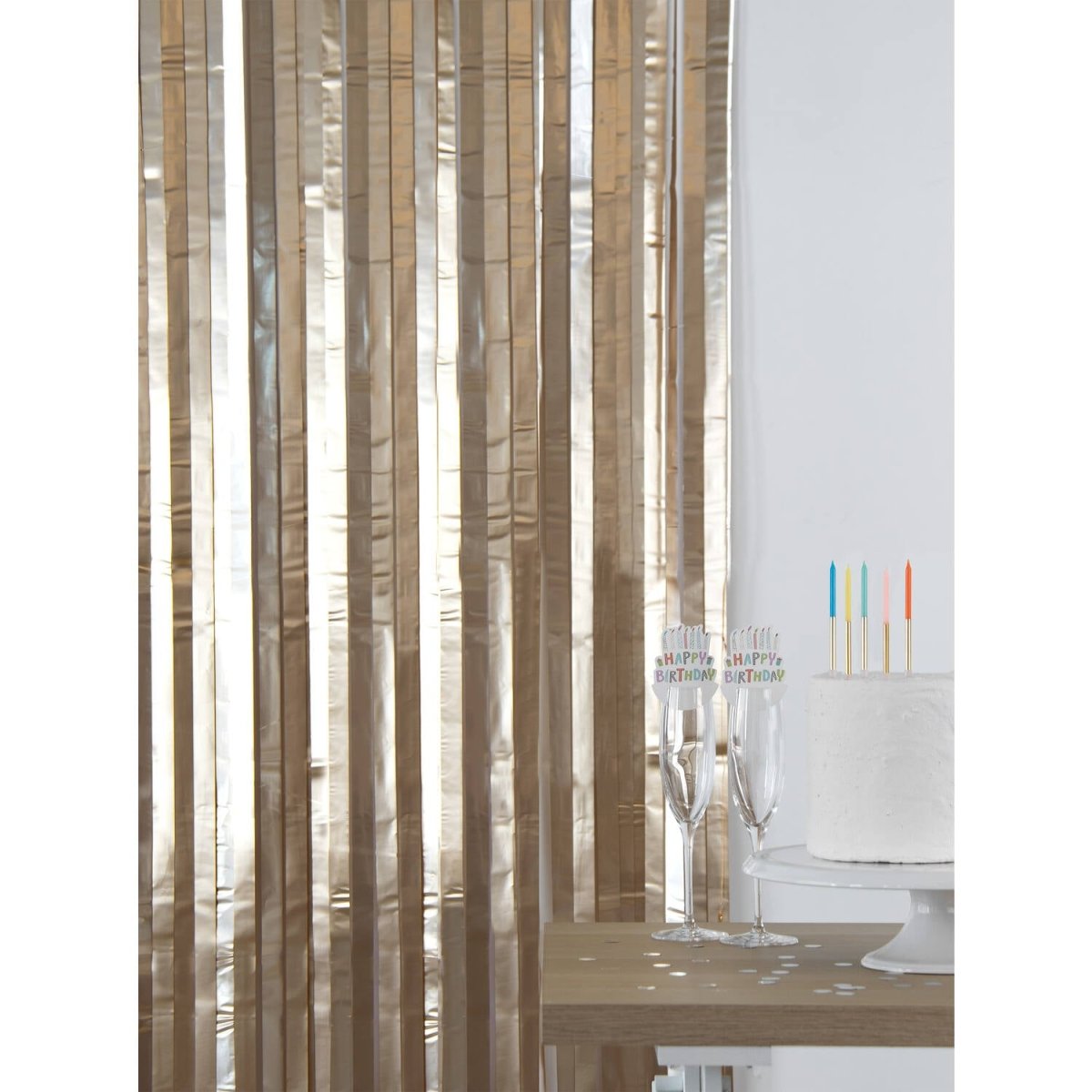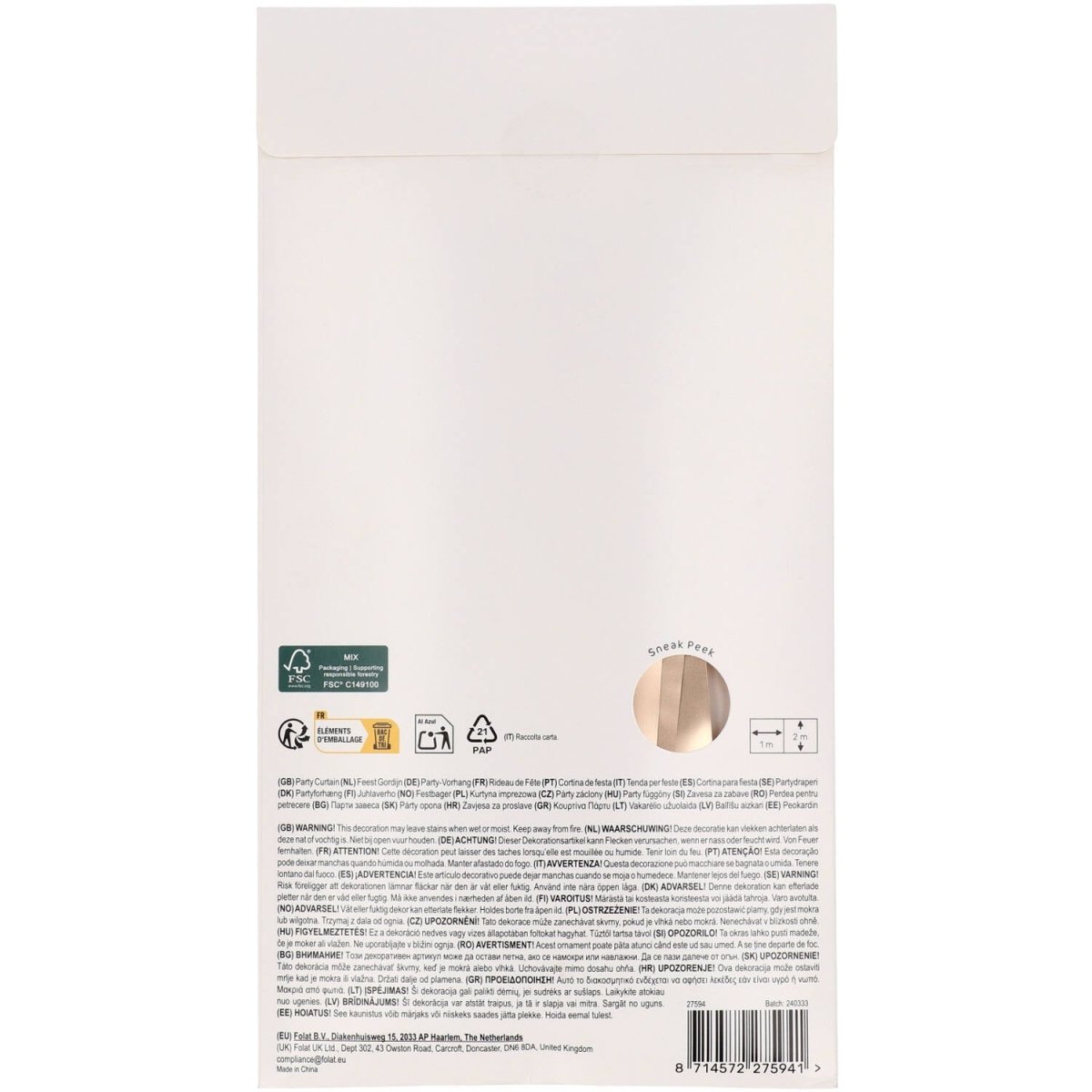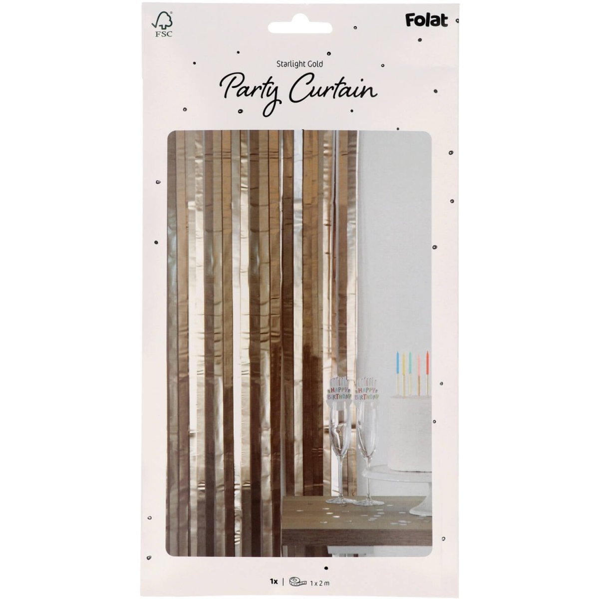 Dla szykownej atmosfery. Kurtyna imprezowa - matowe złoto - 1 x 2 m. Zawartość: 1 kurtyna imprezowa. Do wykorzystania na przykład podczas następujących przyjęć/imprez okolicznościowych: Urodziny, Impreza tematyczna. Elegancka kurtyna imprezowa z szerokimi złotymi paskami o szerokości 2,5 cm. Świetnie sprawdzi się jako kurtyna drzwiowa, ale także jako tło do gustownych zdjęć. Dzięki poręcznemu samoprzylepnemu brzegowi ta kurtyna imprezowa jest łatwa do zawieszenia. Ten przedmiot jest wykonany z folii.